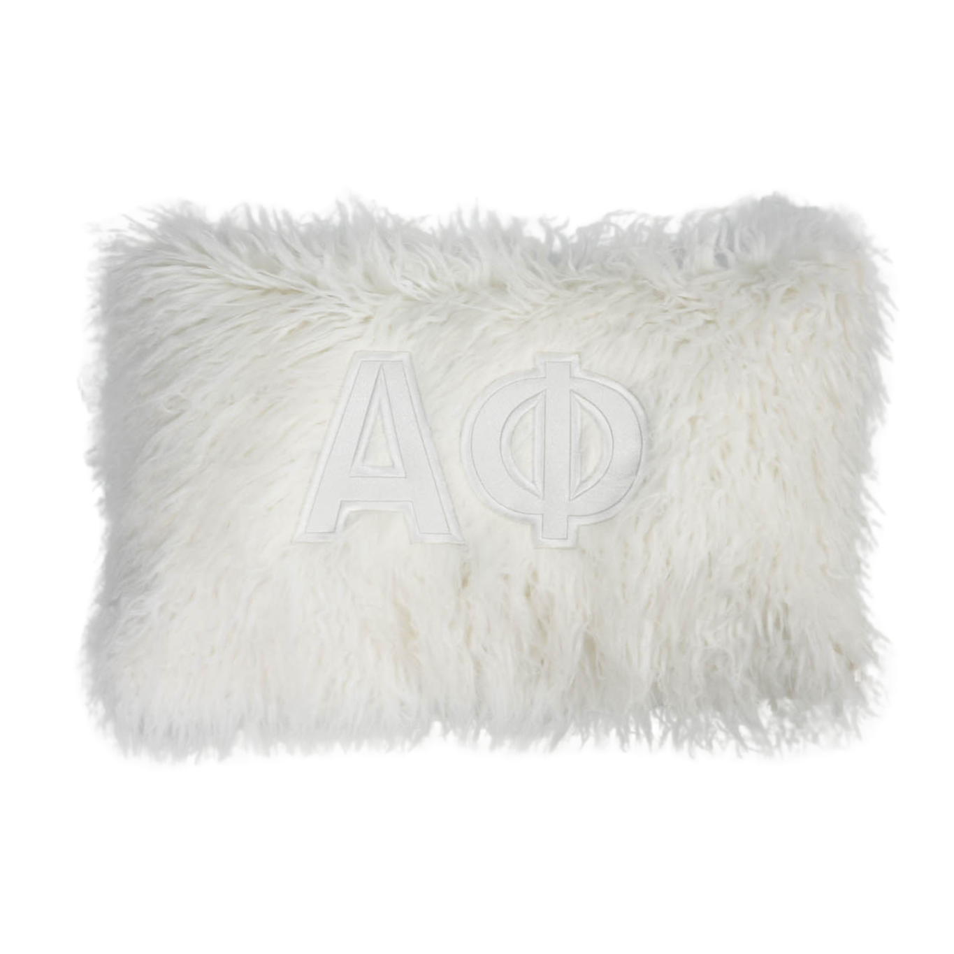 Your dorm room is already stylish, but this pillow is the finishing touch! Featuring a glittery white faux leather applique on soft white faux fur, it adds just the right amount of sparkle while showcasing your sorority pride.